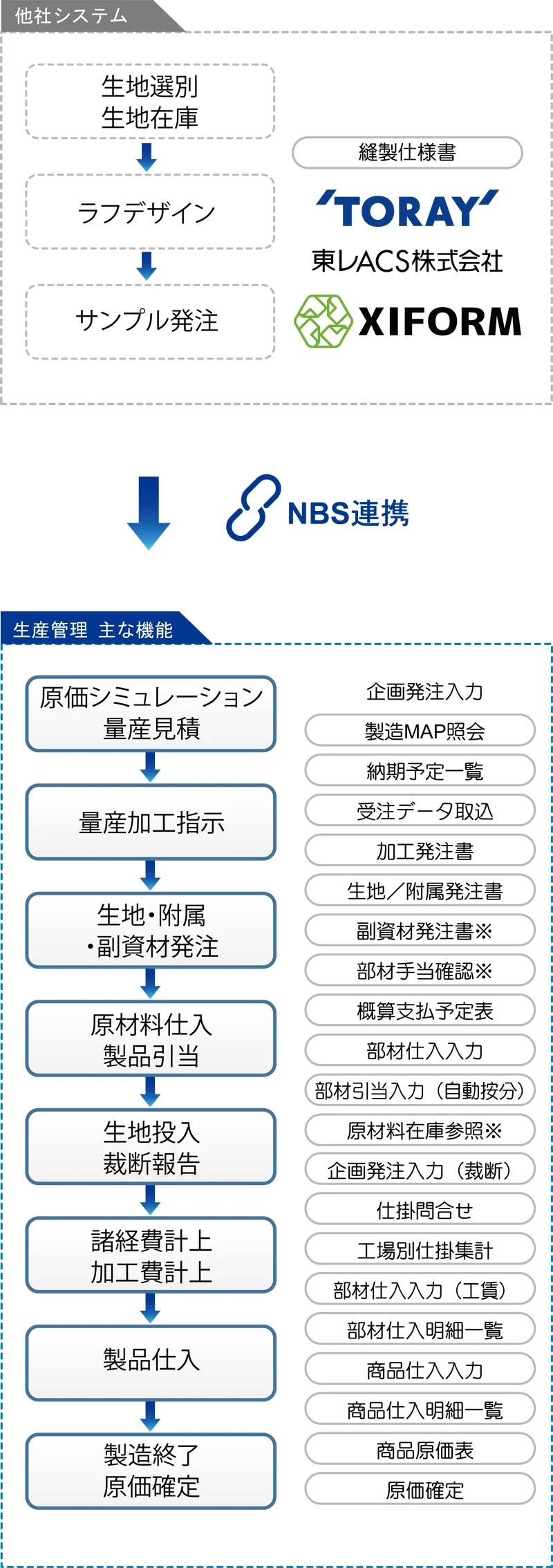 発注から裁断、入庫、原価といった生産関連の一連の業務を管理するツールです。加工指図書をイメージした入力画面となっており、 製品発注数と必要部材の入力で原価シミュレーションが可能です。登録した部材情報は発注データや仕入時に引当データとして活用いただけます。