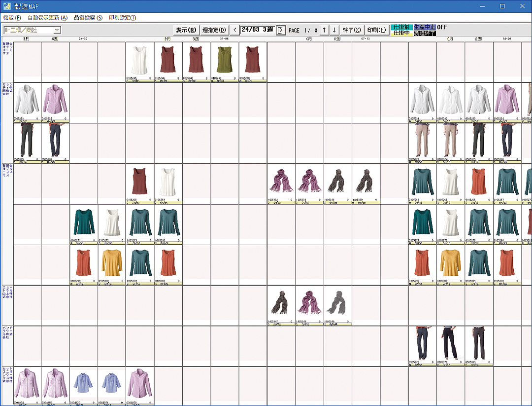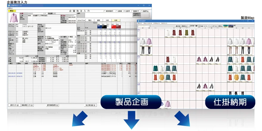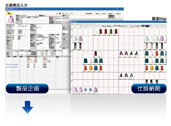 入荷状況を視覚的に捉え仕掛情報を一元化します。入荷状況は工場別・ネーム別・ブランド別・アイテム別に照会できます。発注情報や在庫情報、受注可能数の把握、企画発注入力にも連動し発注情報の修正が可能です。