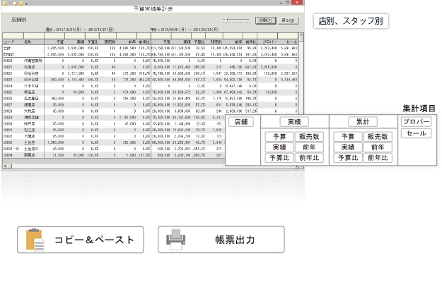 予算比や前年比をみて、各店の売上傾向を掴みまた、短期の実績と中長期の実績を見比べることで、より鮮明に傾向をつかむことができます。状況を素早く察知し的確な指示を出せるようになります。 データはコピー&ペーストで、エクセルをはじめとした各種アプリケーションで利用が可能です。ダイレクトにA4帳票としてプリントアウトもできます。